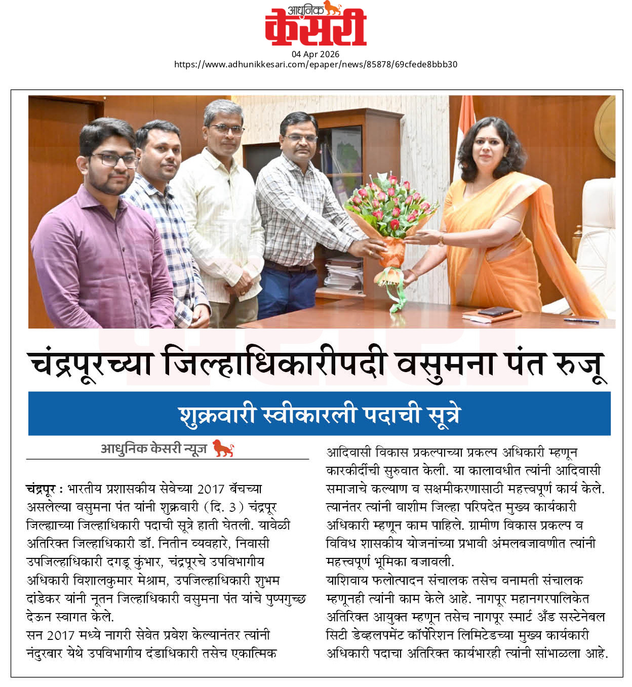 खासदार प्रतिभा धानोरकर यांनी राजमाता राणी हिराई सोहळ्याला गालबोट लावले ; आदिवासी समाजाच्या वतीने तीव्र निषेध हडसणी फाट्यावर भीषण अपघात, भरधाव कारने दोन दुचाकींना उडवले ४ जण ठार : एकाची प्रकृती चिंताजनक महिला आरक्षणावर खुल्या चर्चेस काँग्रेस तयार; मुख्यमंत्र्यांनी सांगावे कधी व कुठे चर्चा करायची? मोदींनाही चर्चेला बोलवा: खा. प्रणिती शिंदे चंद्रपूर  जिल्ह्यात उष्णतेच्या लाटेचा इशारा वाढत्या उन्हामुळे शाळा - महाविद्यालये सकाळच्या सत्रात 11 वाजेपर्यंतच ठेवा ; जिल्हाधिकारी वसुमना पंत यांनी निर्गमित केले आदेश खासदारांचे विधान दुर्दैवी व निंदनीय : आ.करण देवतळे पाचोरा-हडसन रस्त्यावर बिबट्याचा वावर; परिसरातील शेतकरी तसेच मजुरांनी सतर्क रहा! नूतन विभागीय आयुक्त जी.श्रीकांत यांनी कार्यभार स्वीकारला नाल्याच्या पाण्यात बडून चार बालके दगावली  विश्वरत्न डॉ. बाबासाहेब आंबेडकर सार्वजनिक जयंती निमित्त  "नागसेन - मिलिंद" या तीन दिवशीय व्याख्यानमालेचा आज प्रारंभ..!